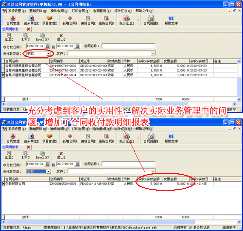 1.新版的里諾合同管理軟件充分考慮到客戶的實用性,解決實際業務管理中的問題,增加了合同收付款明細報表,如下圖所示:
