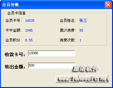 ●會員卡操作:當(dāng)儲值卡、升級卡需要充值時,在主界面選擇“會員管理”,點擊“會員續(xù)費”按鈕進行充值。在“會員卡”窗口中包括會員卡掛失、取消掛失、會員換卡 、會員卡轉(zhuǎn)帳。會員換卡操作,只需在“會員換卡”窗口中輸入新的會員卡號,不需要再輸入會員基本信息系統(tǒng)自動將舊卡內(nèi)的所有信息轉(zhuǎn)移到新卡內(nèi)。會員轉(zhuǎn)帳操作,當(dāng)儲值卡、升級卡會員不再使用此卡 但卡內(nèi)還有余額,可以轉(zhuǎn)到指定的儲值卡、升級卡內(nèi)。如果卡內(nèi)只剩底金時是不能轉(zhuǎn)帳。此功能只支持儲值卡和折扣卡會員。