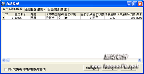 ●提醒查詢:在主界面上點擊“到期提醒”按鈕打開自動提醒窗口。在這里不能添加會員卡到期和生日提醒,會員卡到期提醒和生日提醒是在添加會員信息時系統(tǒng)自動添加 到到期提醒中。