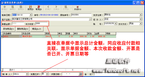 單據制單界面實現快捷鍵操作、回車鍵換行,最大程度地節省人工操作和人腦思維,可直接在單據中顯示總計金額,同應收應付款相關聯,顯示單據金額、本次收款金額、開票是否已開、開票日期等信息。只要會銷售,你就會制單!